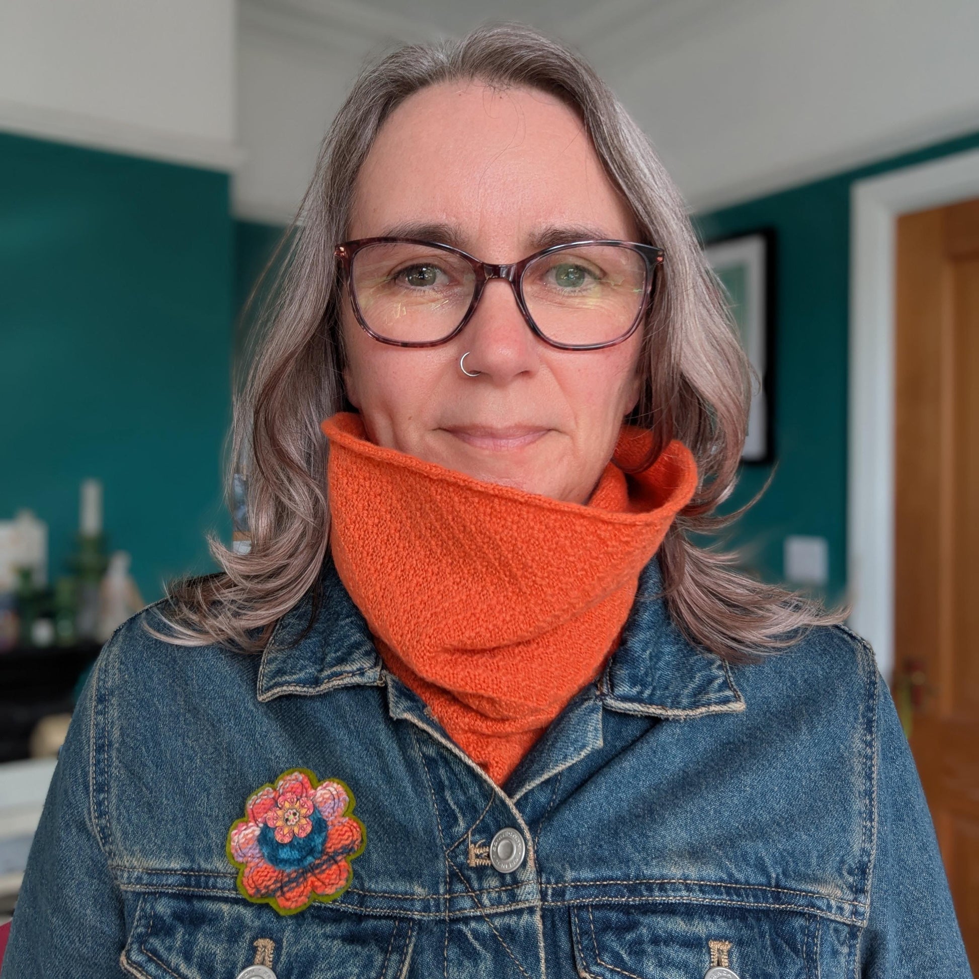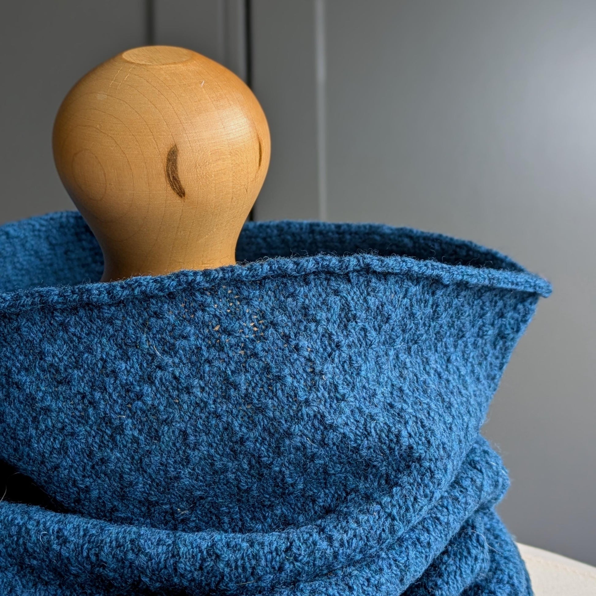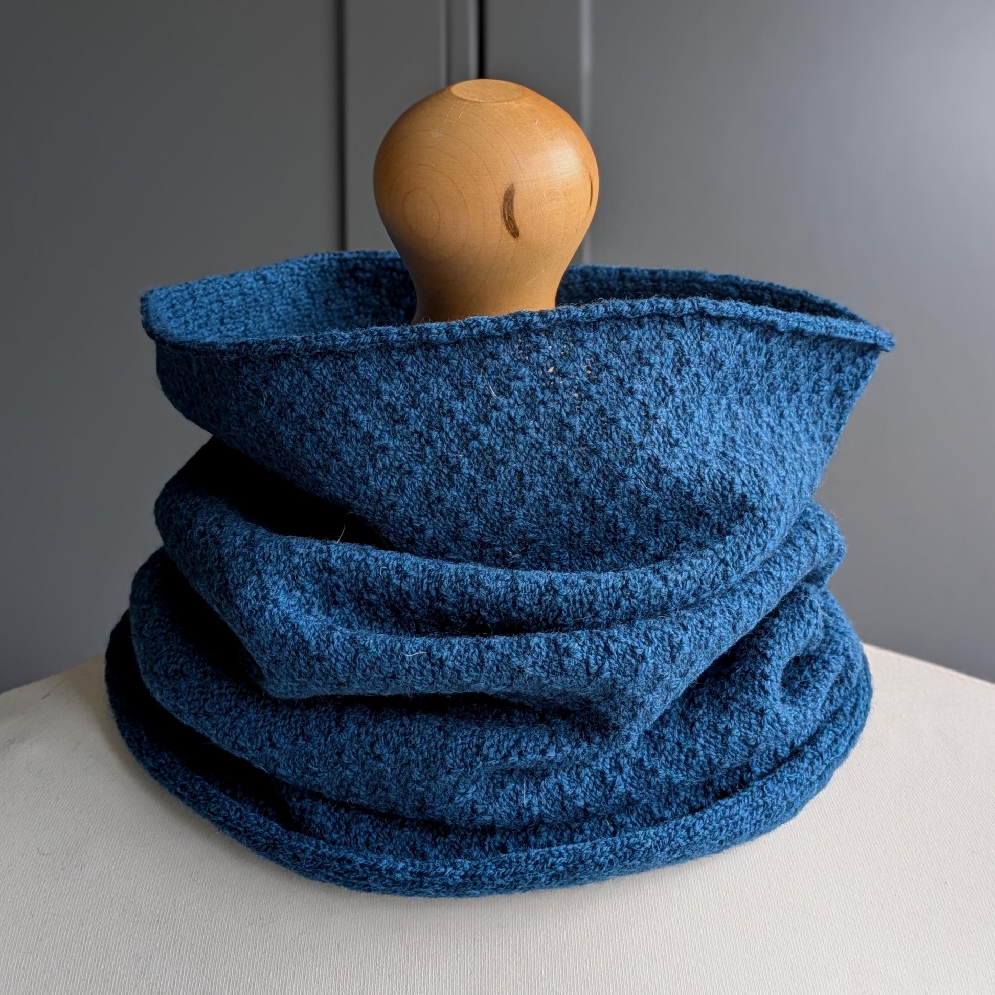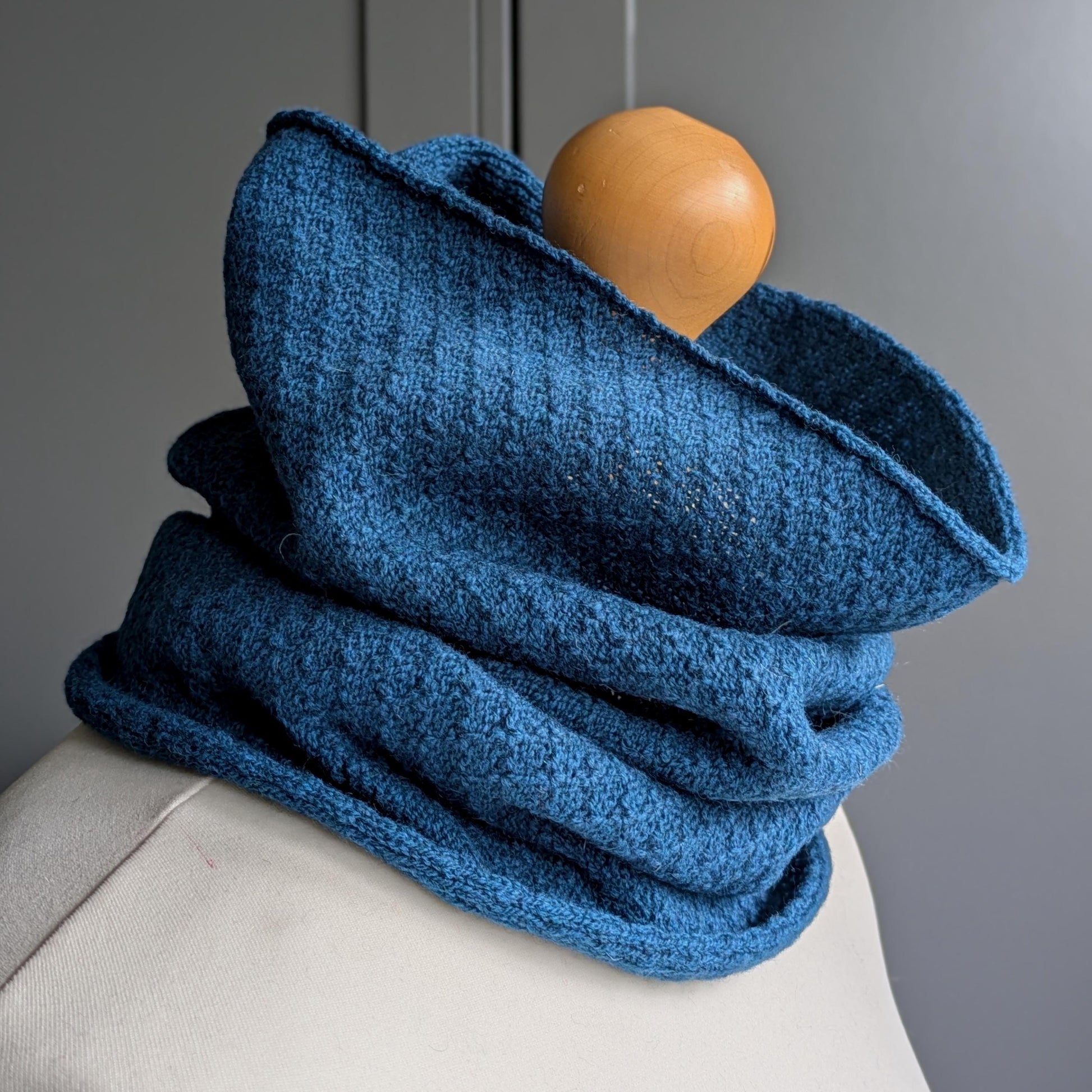 This Merino lambswool cowl has been knitted on a vintage knitting machine using a slip stitch to create a beautiful textured pattern. It's beautifully soft against the skin as well as being warm and cosy.