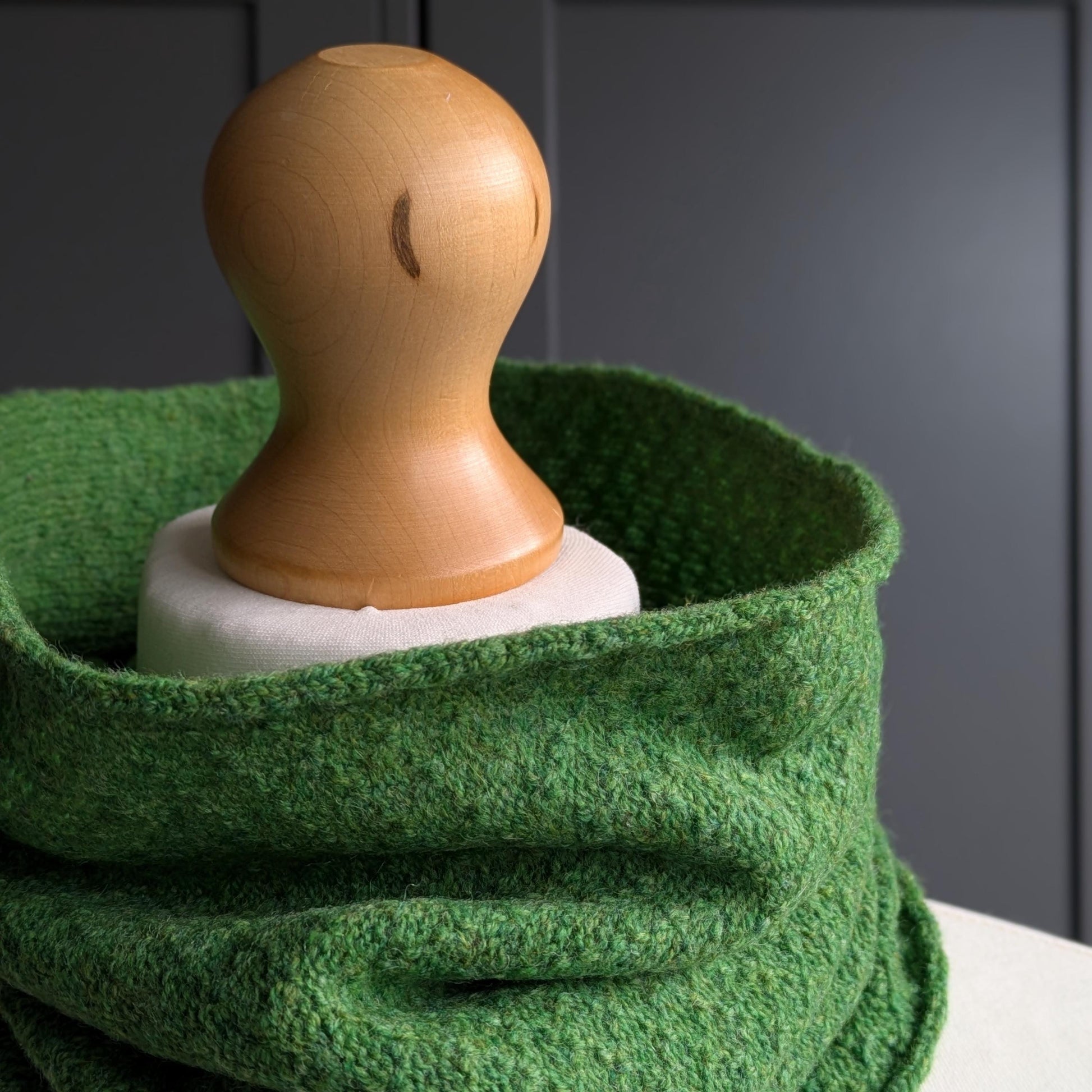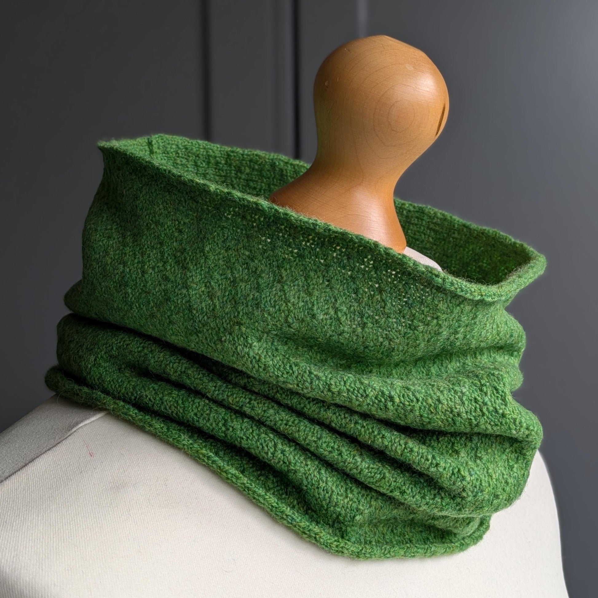 This Merino lambswool cowl has been knitted on a vintage knitting machine using a slip stitch to create a beautiful textured pattern. It's beautifully soft against the skin as well as being warm and cosy.