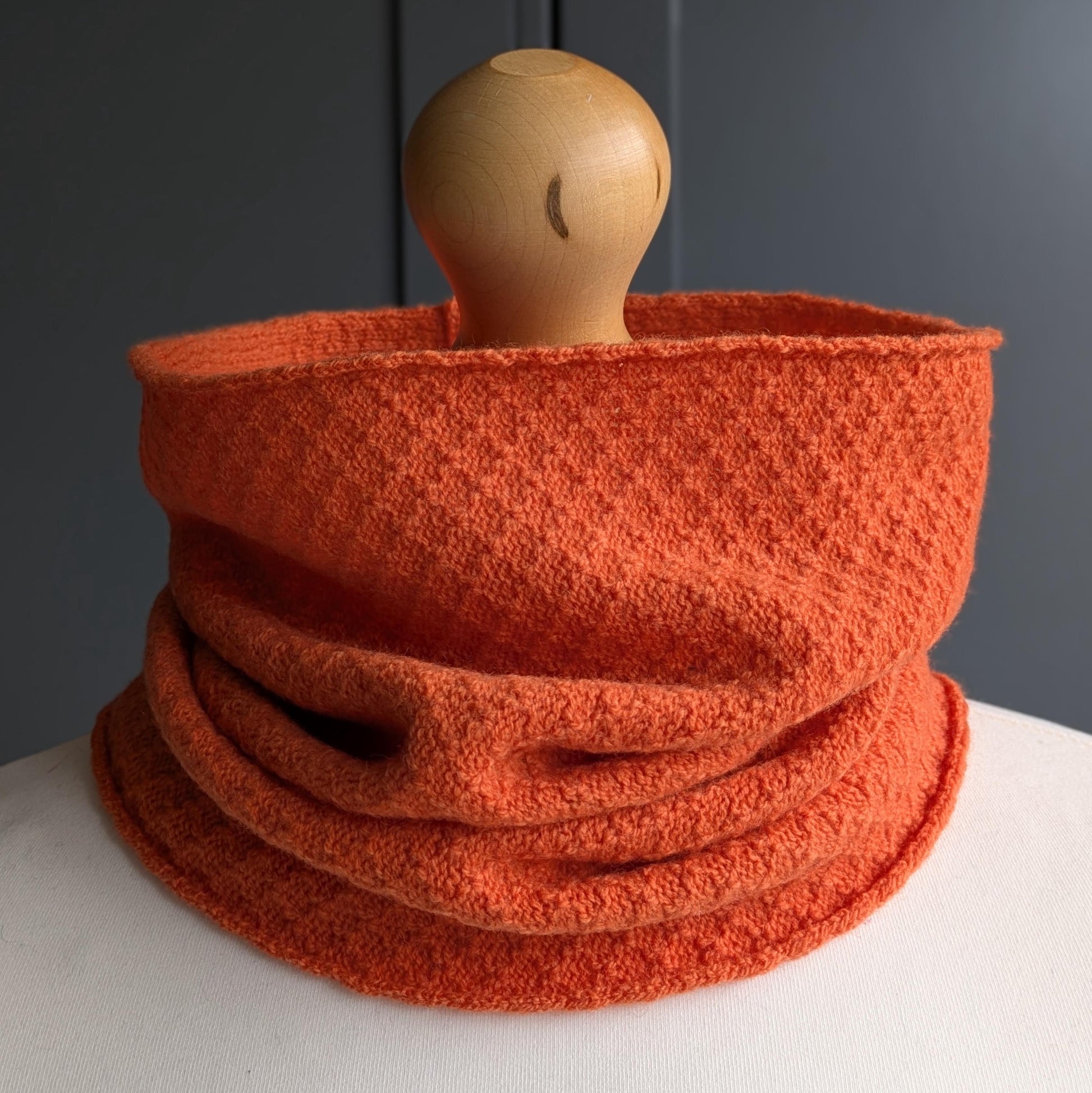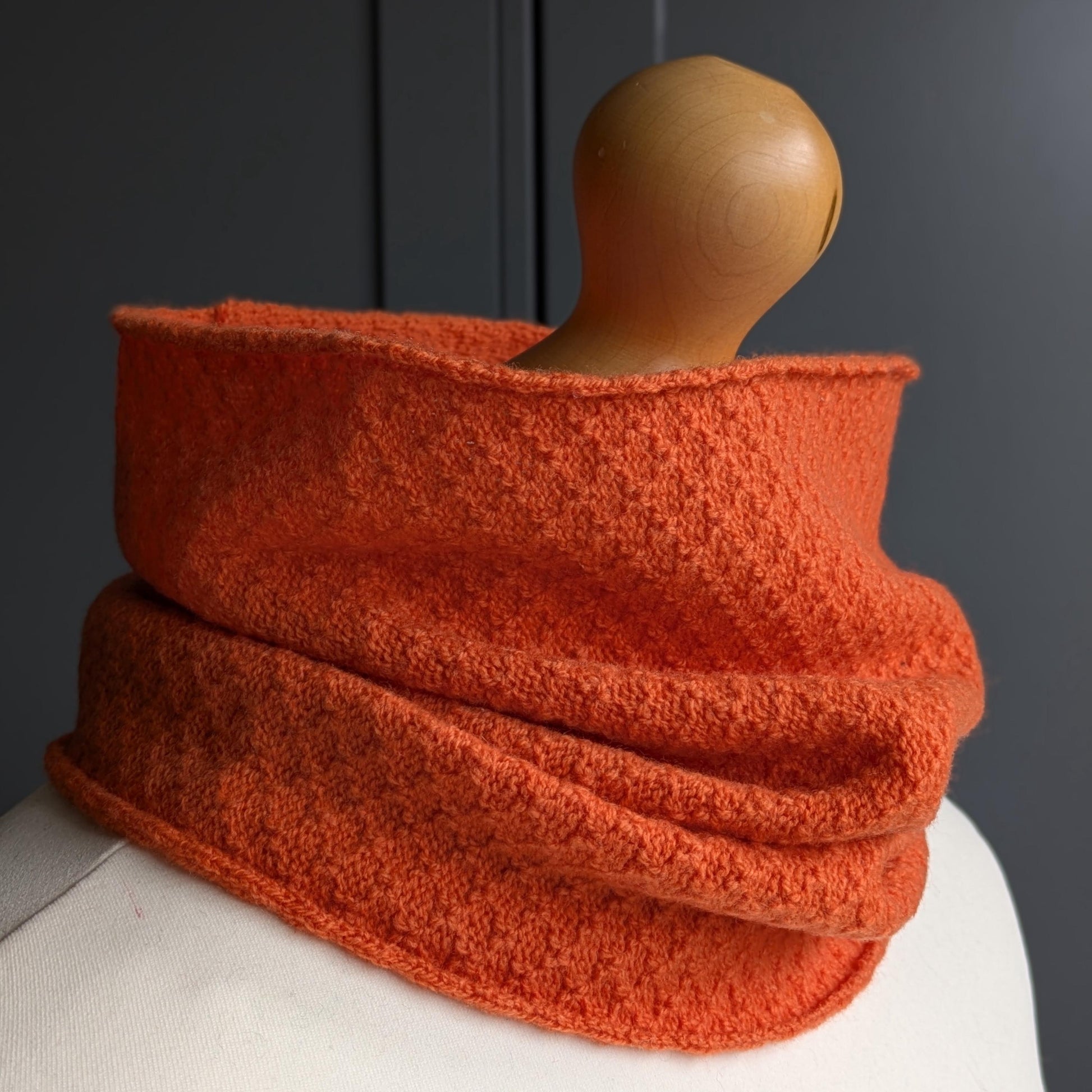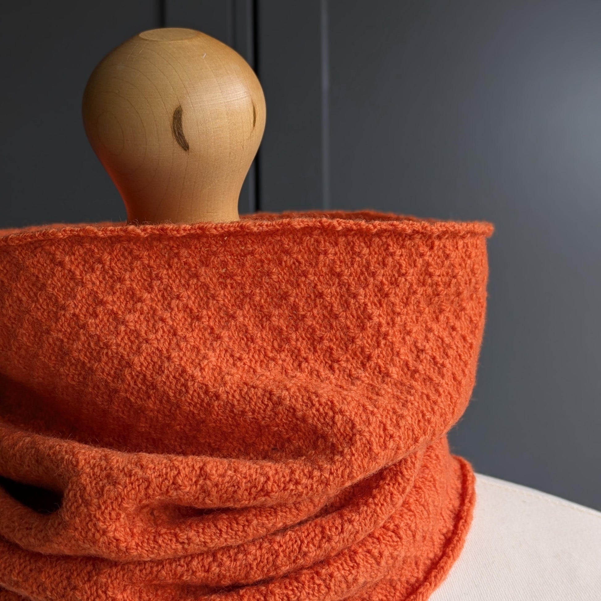 This Merino lambswool cowl has been knitted on a vintage knitting machine using a slip stitch to create a beautiful textured pattern. It's beautifully soft against the skin as well as being warm and cosy.