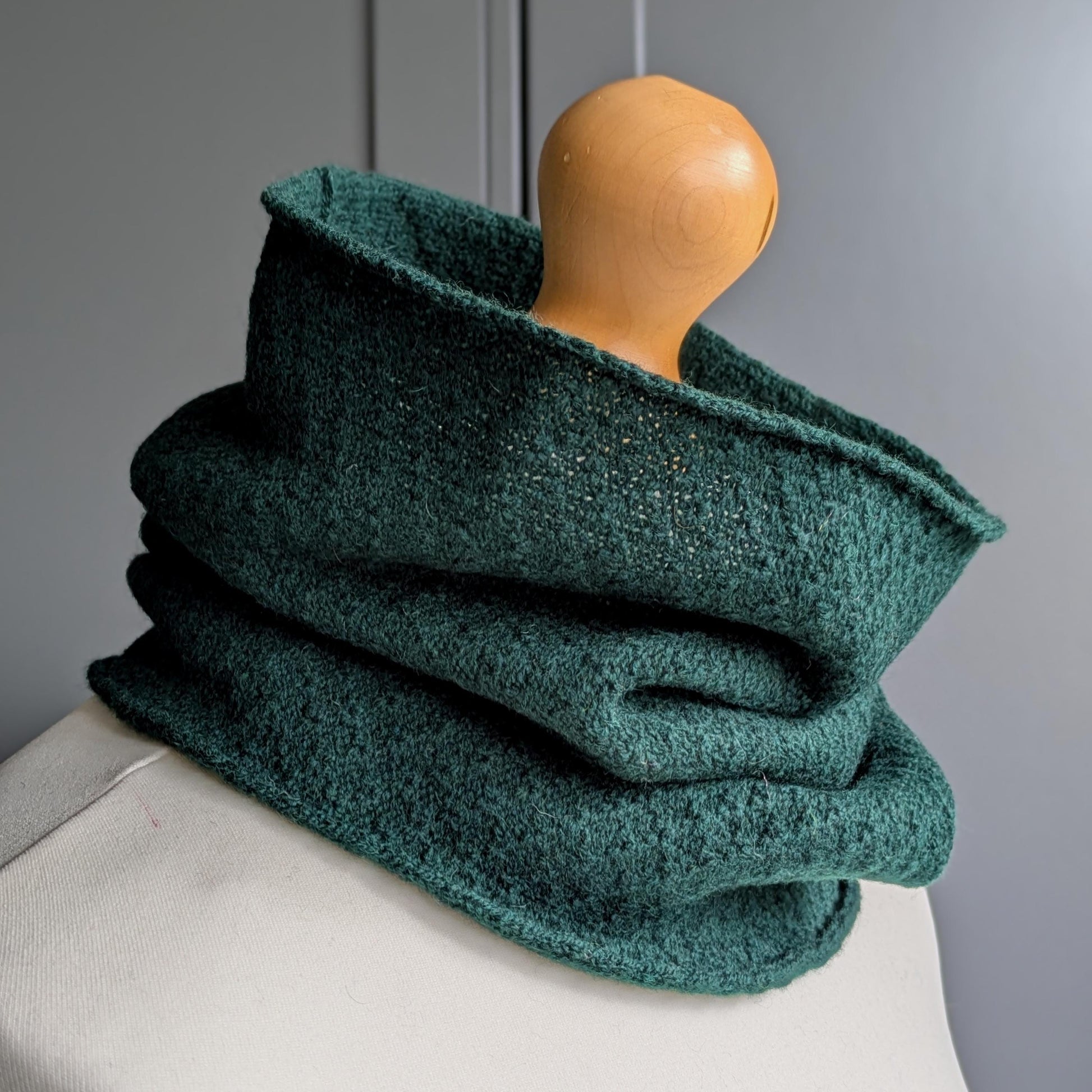 This Merino lambswool cowl has been knitted on a vintage knitting machine using a slip stitch to create a beautiful textured pattern. It's beautifully soft against the skin as well as being warm and cosy.