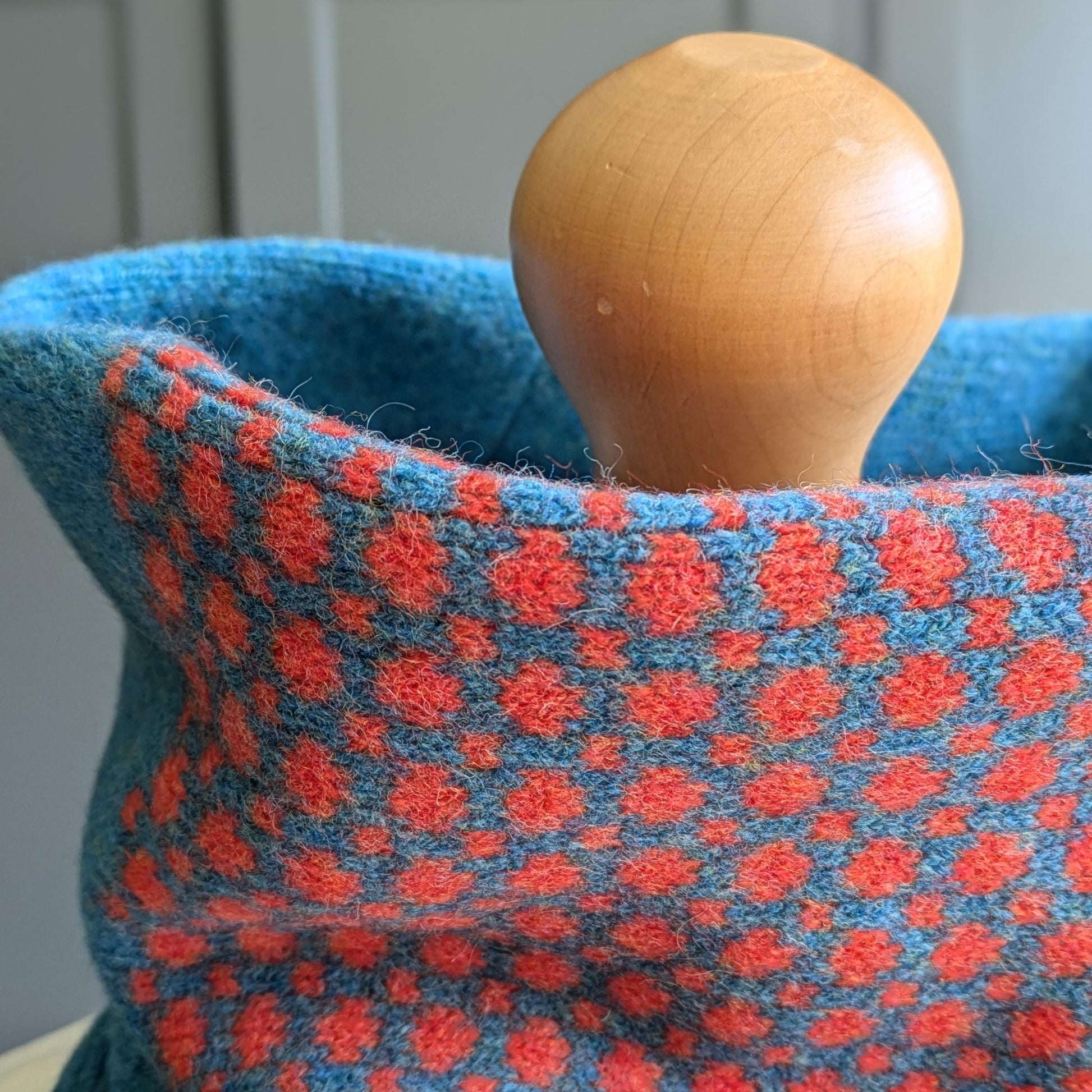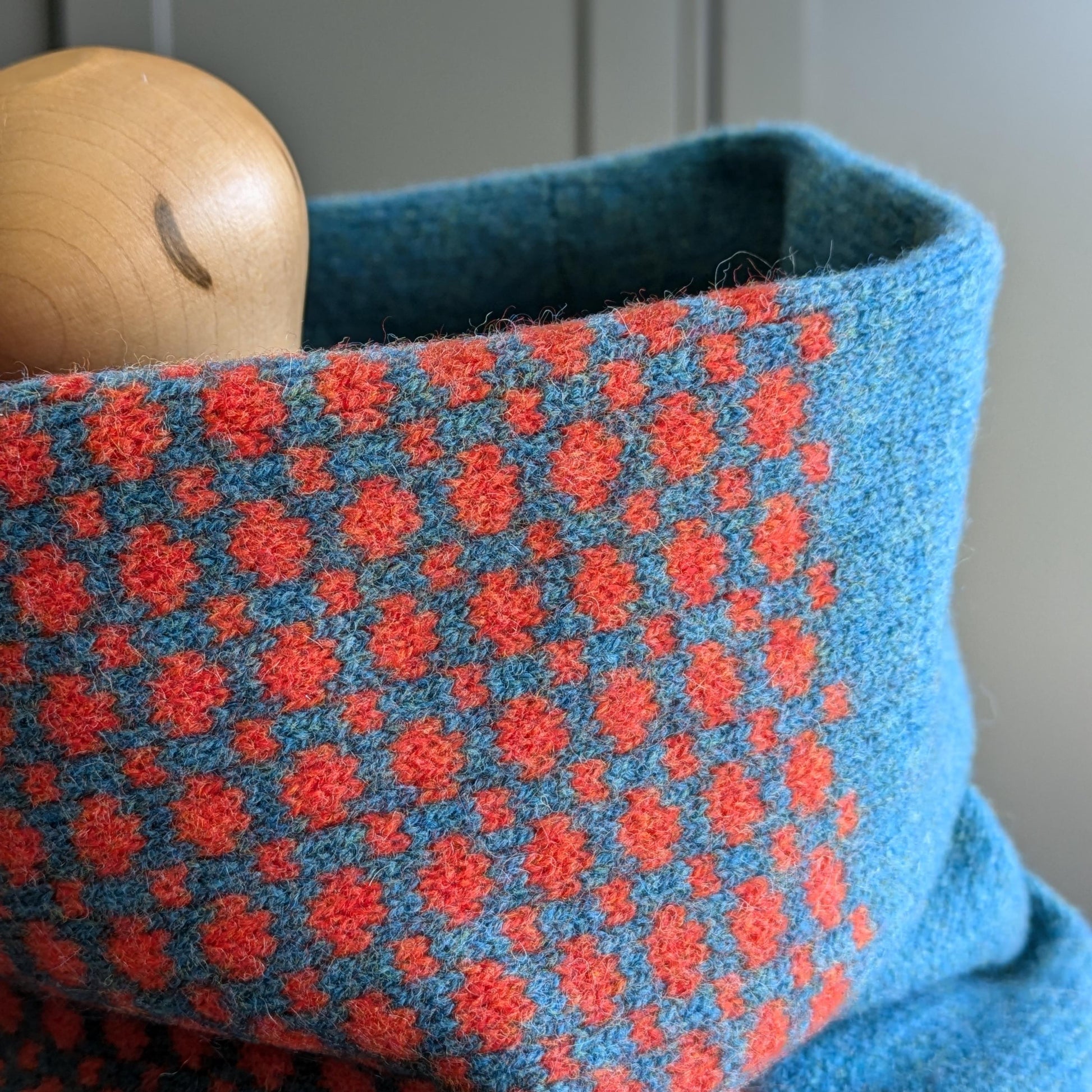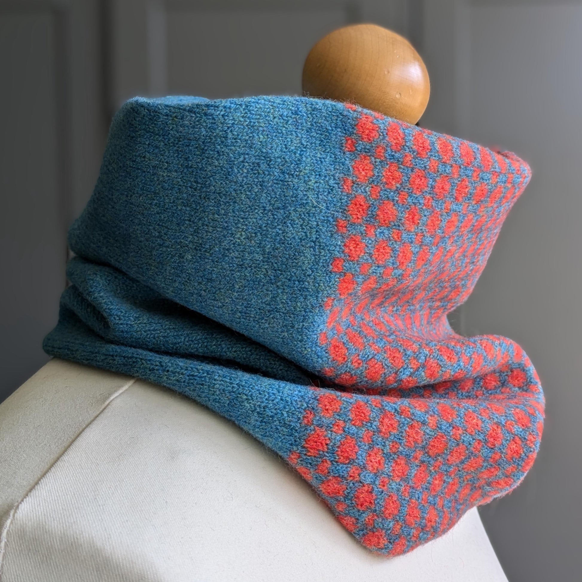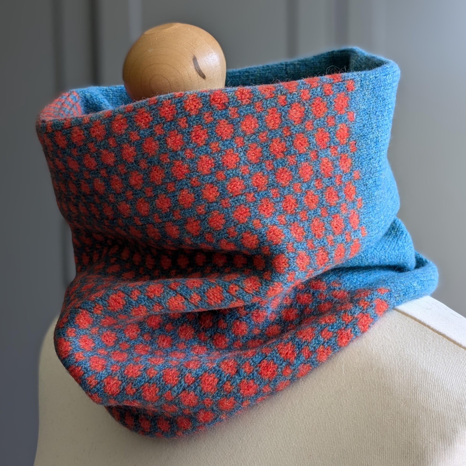 This Merino lambswool fair isle cowl has been knitted on a vintage knitting machine with a dots and spots design. It's blue with orange spots. It's beautifully soft against the skin as well as being warm and cosy. This cowl is made up of a single layer, but it's long enough to fold over to create a double thickness cowl if desired.