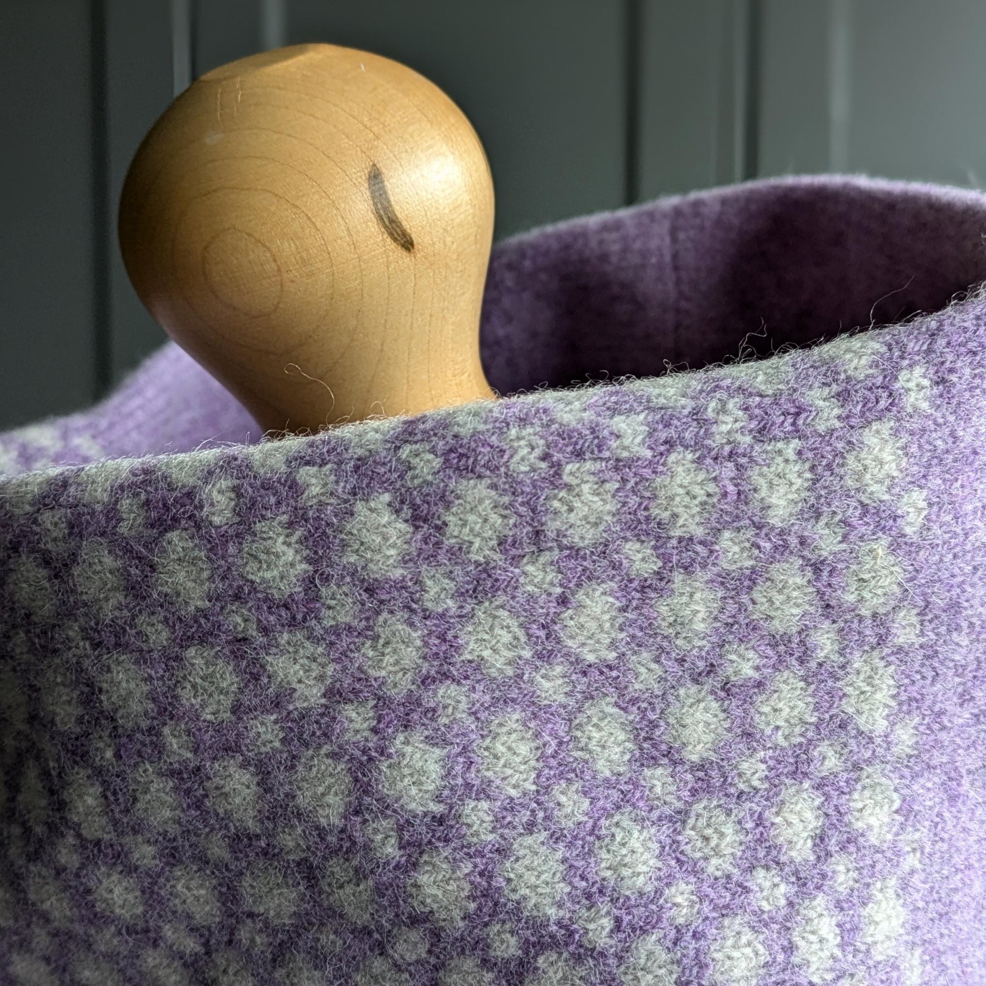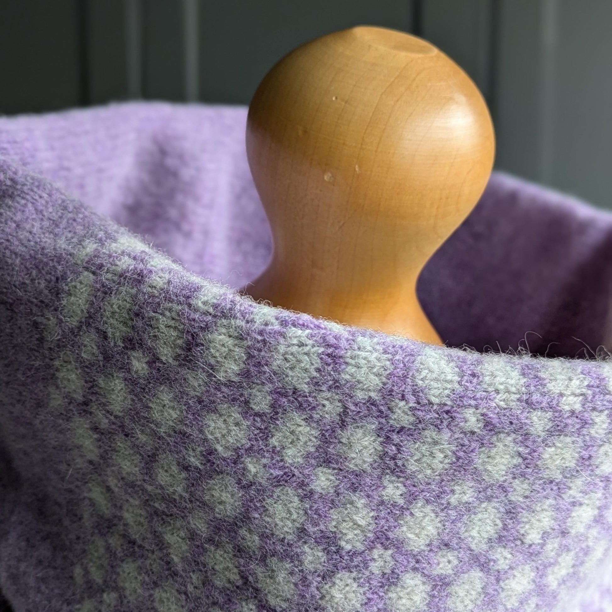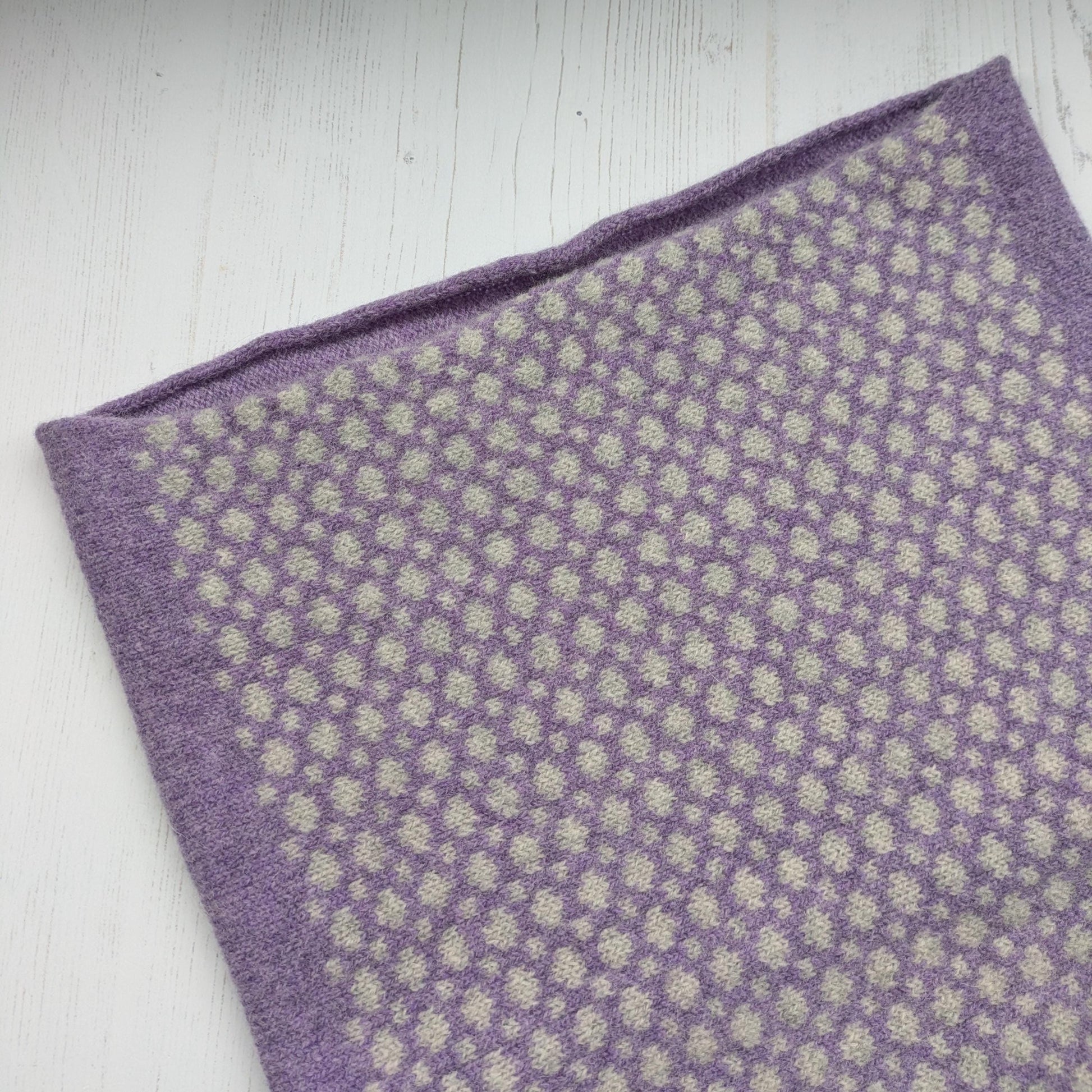 This Merino lambswool fair isle cowl has been knitted on a vintage knitting machine with a dots and spots design. It's lilac with grey spots. It's beautifully soft against the skin as well as being warm and cosy. This cowl is made up of a single layer, but it's long enough to fold over to create a double thickness cowl if desired.