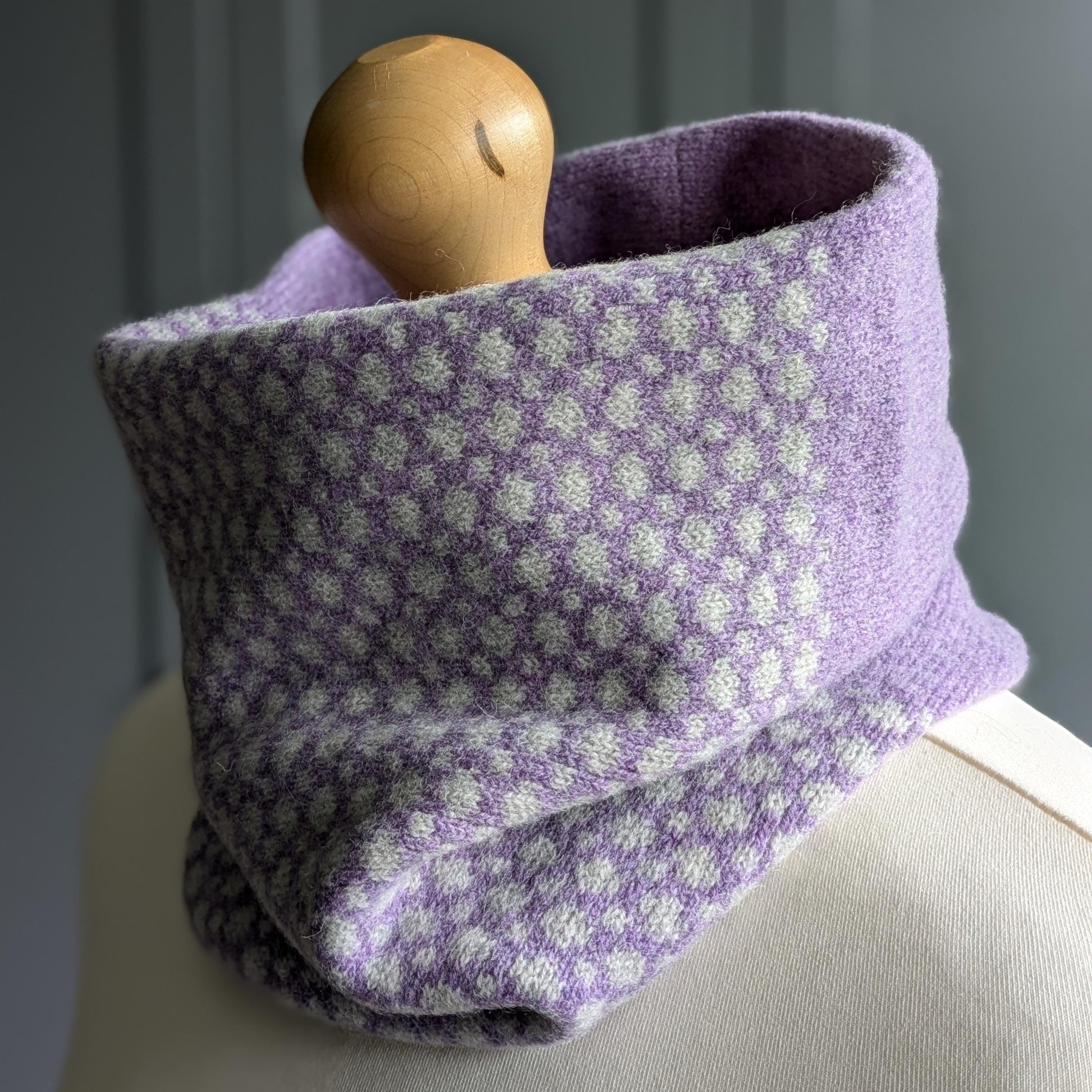Lambswool knitted Fair Isle cowl in dots and spots design - lilac with grey spots