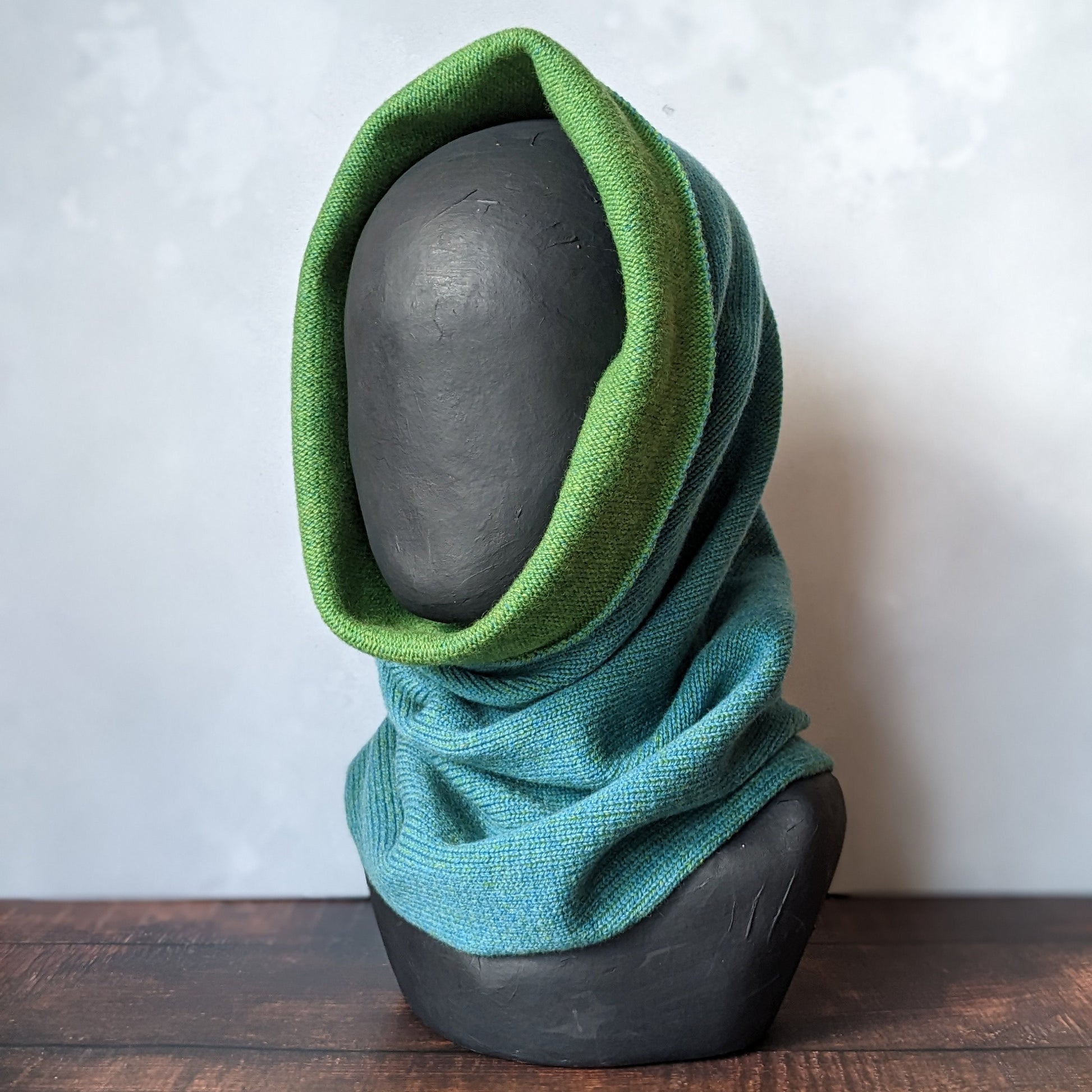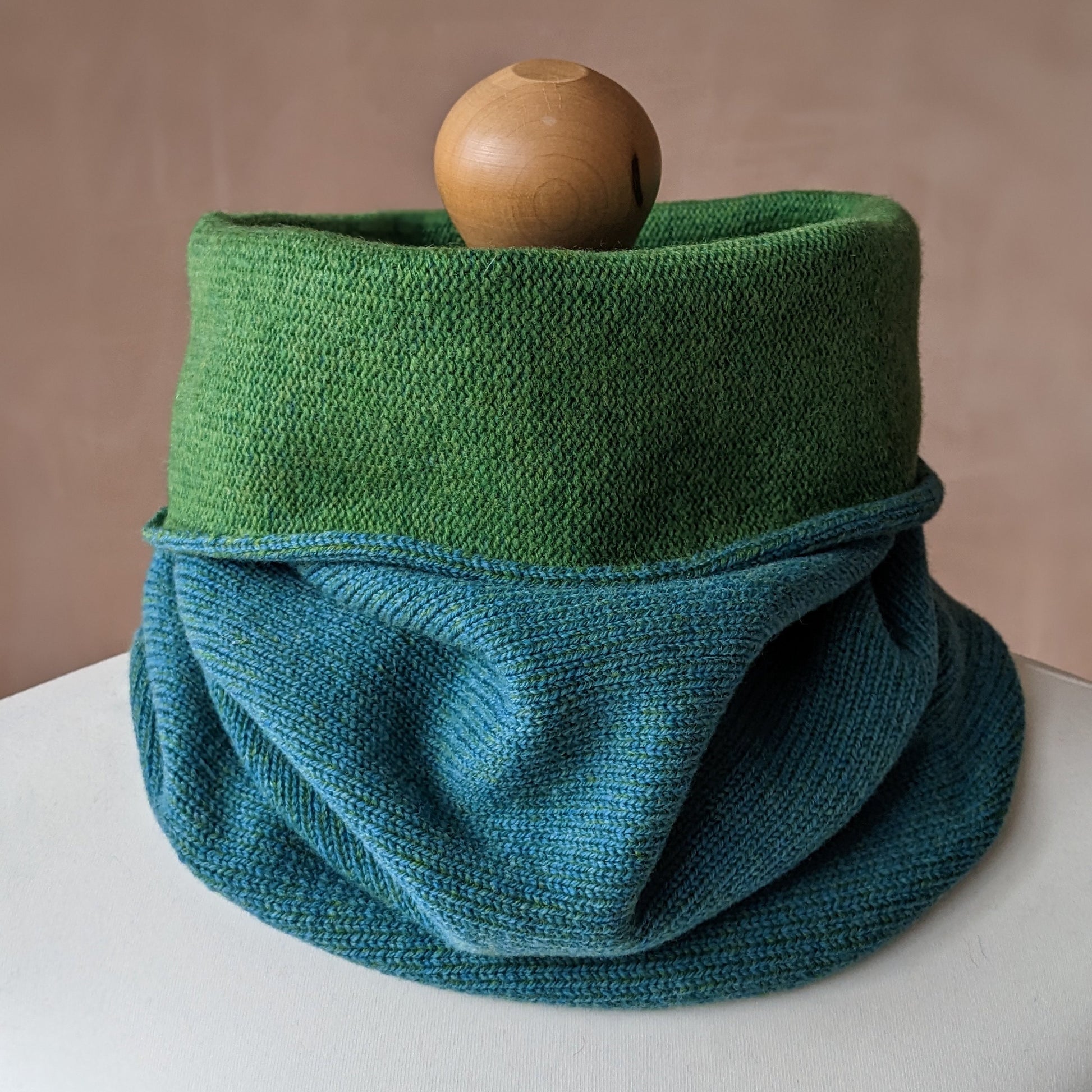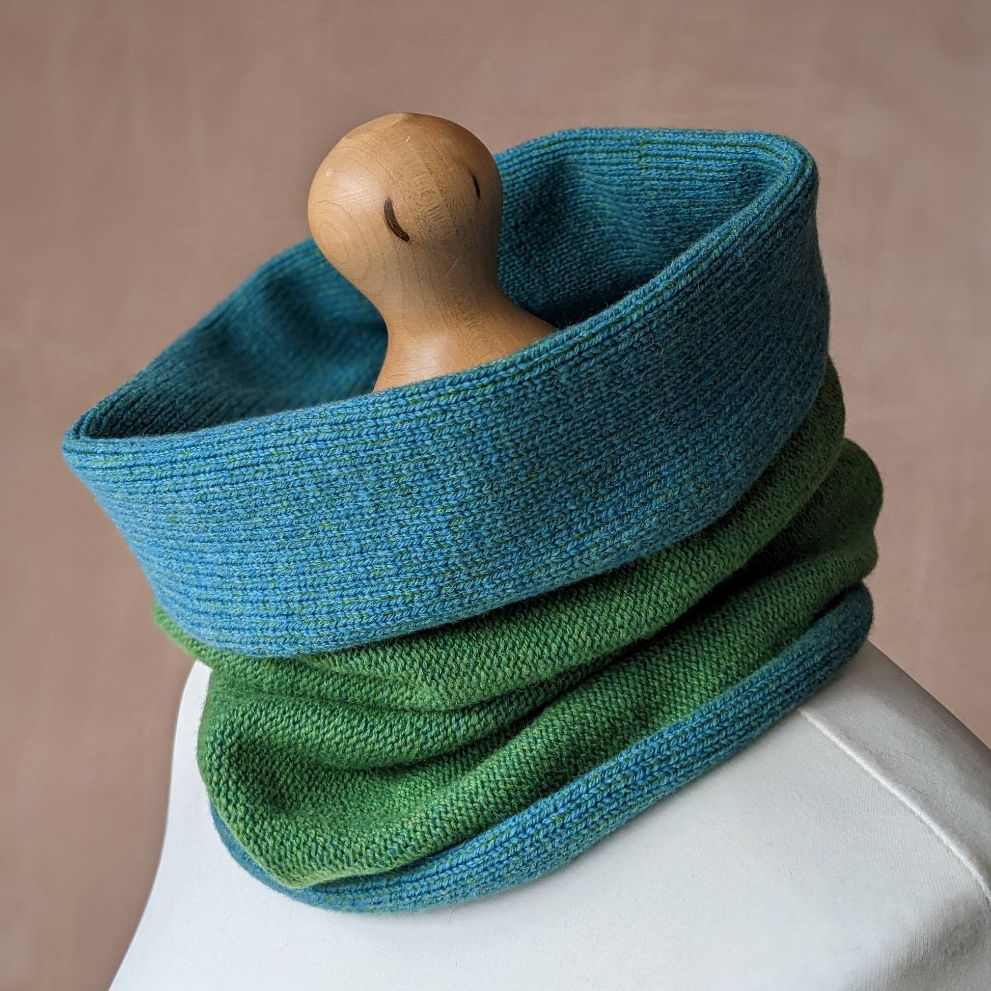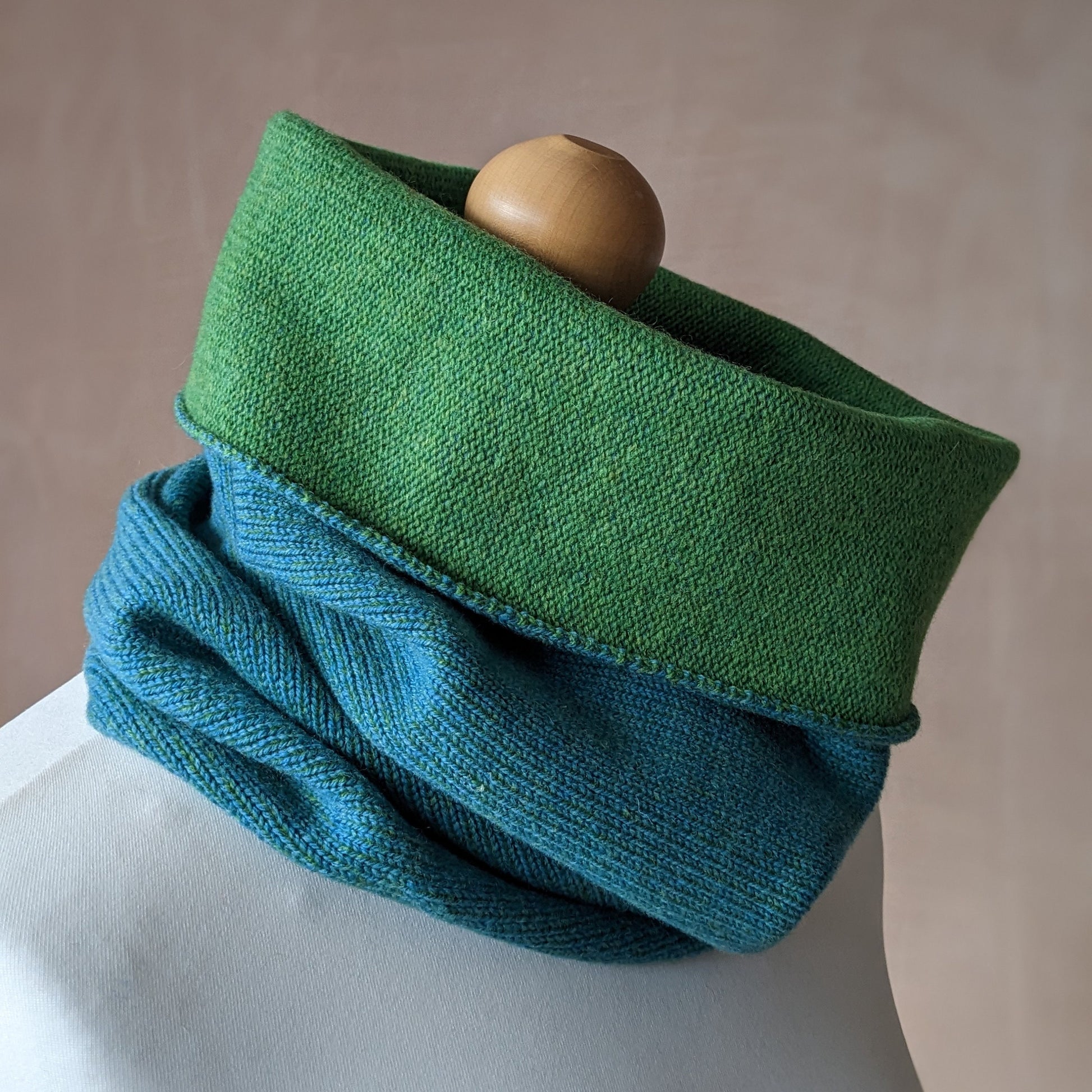 This reversible Merino lambswool snood has been knitted using a plating technique so the knit side of the fabric is blue and the purl side is green. It can be worn either way or folded back revealing both colours, as shown in the photographs.