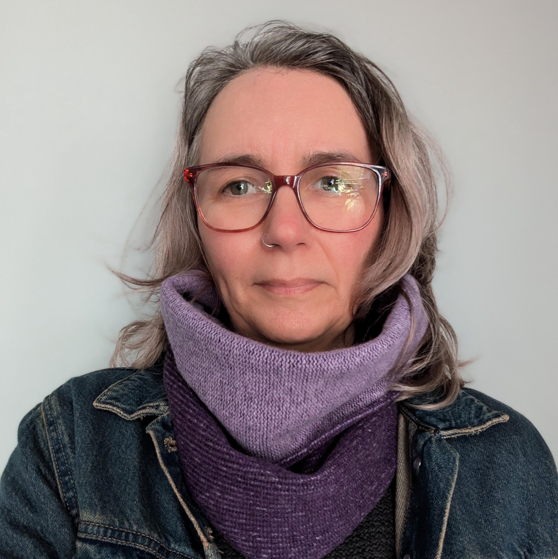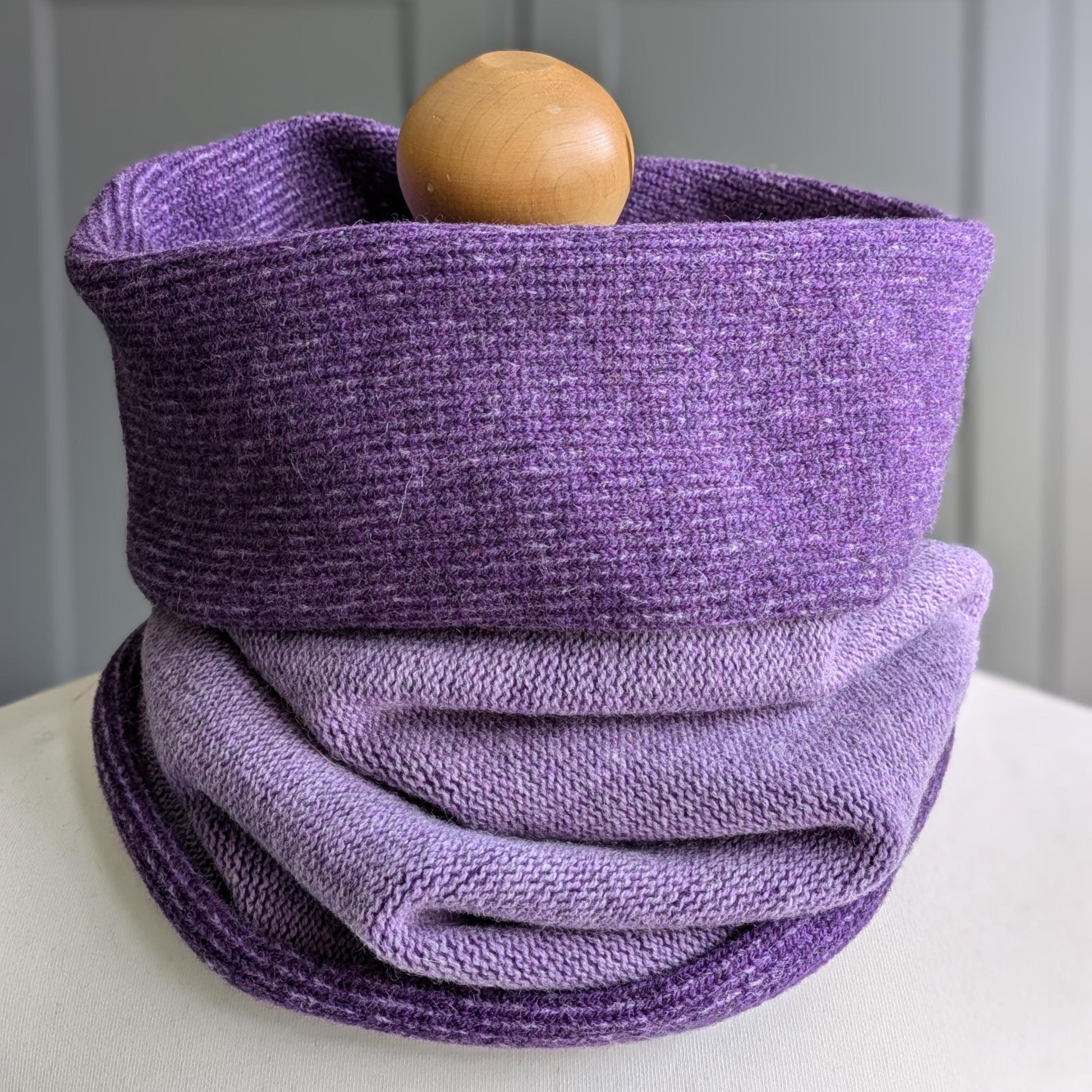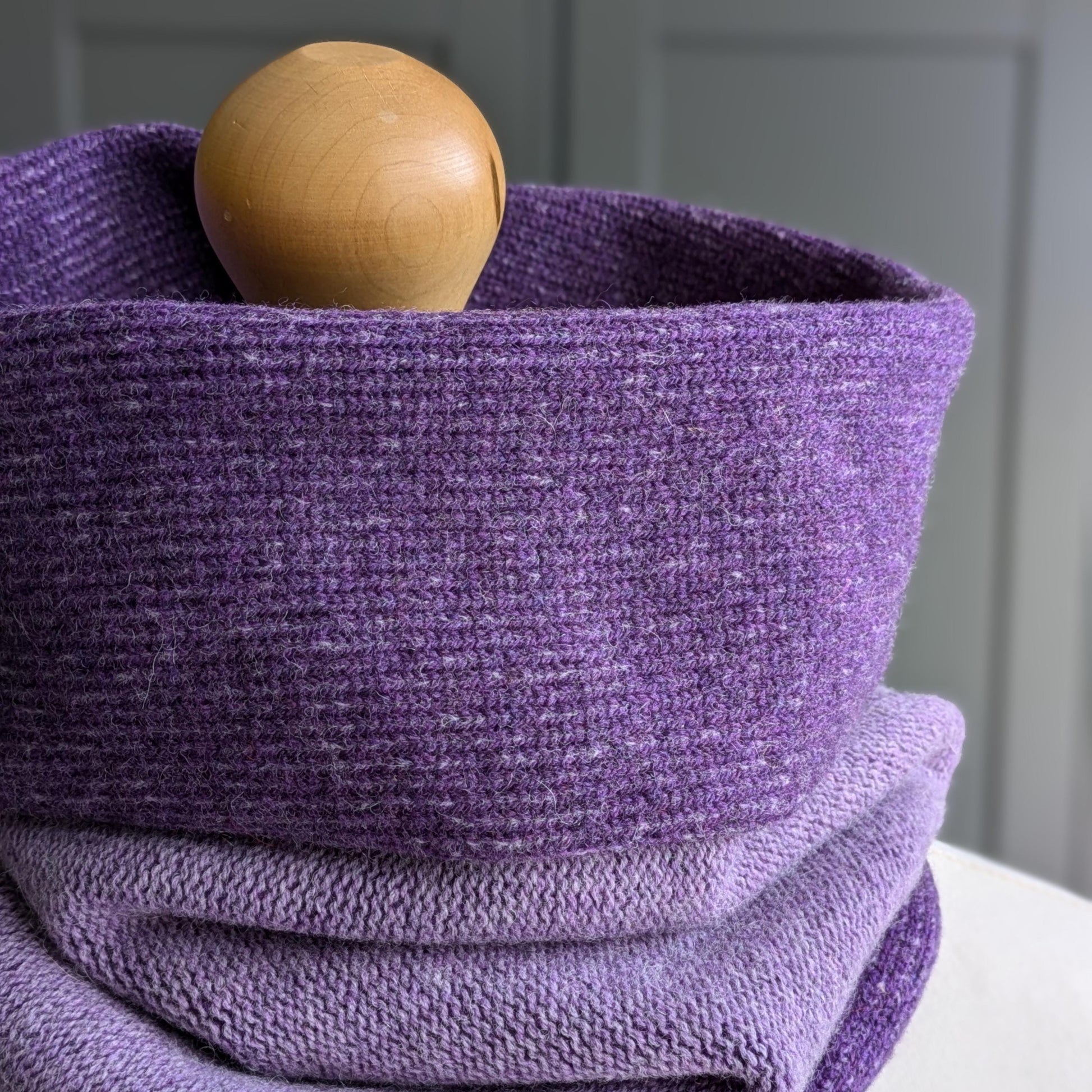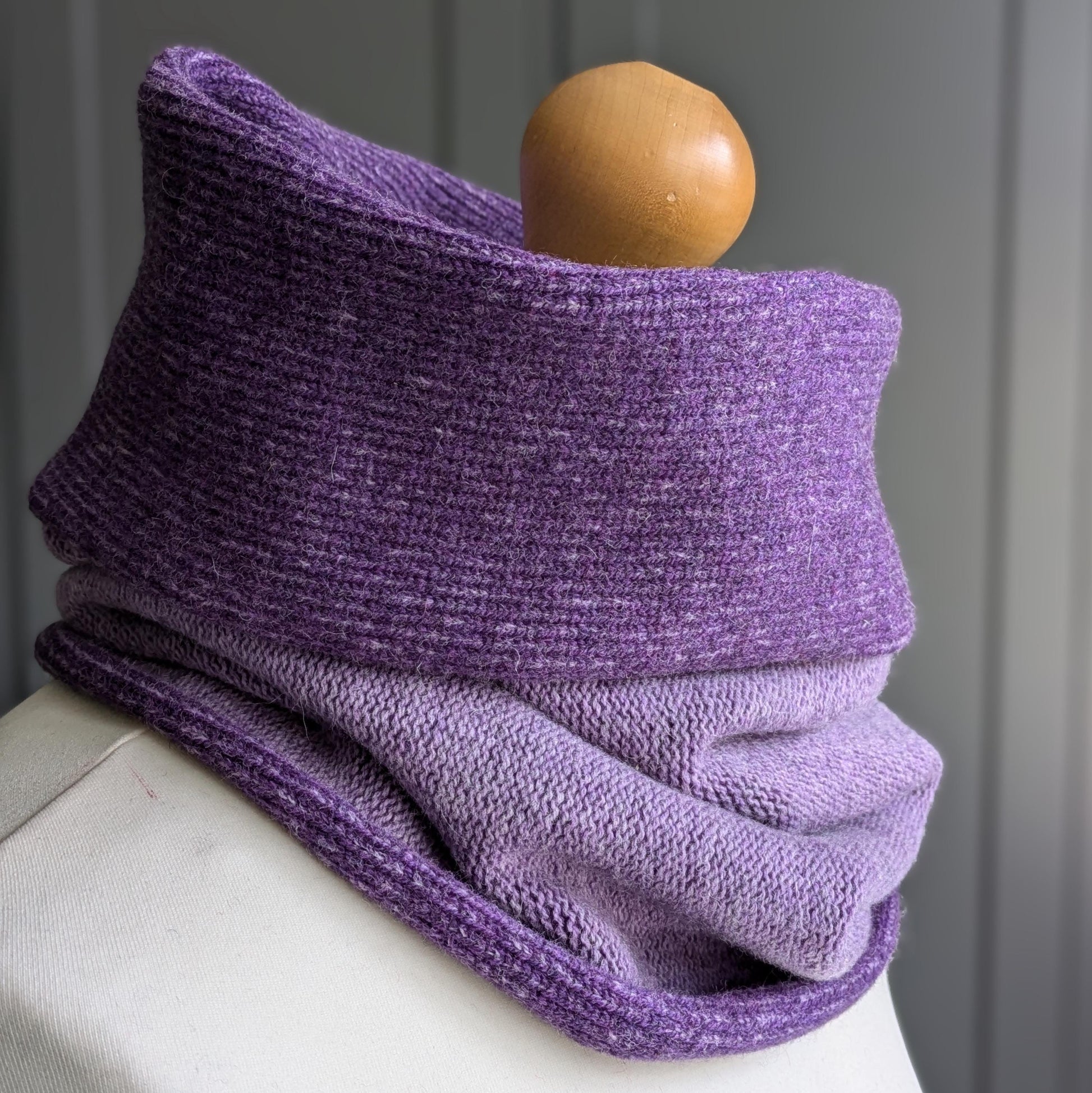This reversible Merino lambswool snood has been knitted using a plating technique so the knit side of the fabric is deep purple and the purl side is lilac. It can be worn either way or folded back revealing both colours, as shown in the photographs.