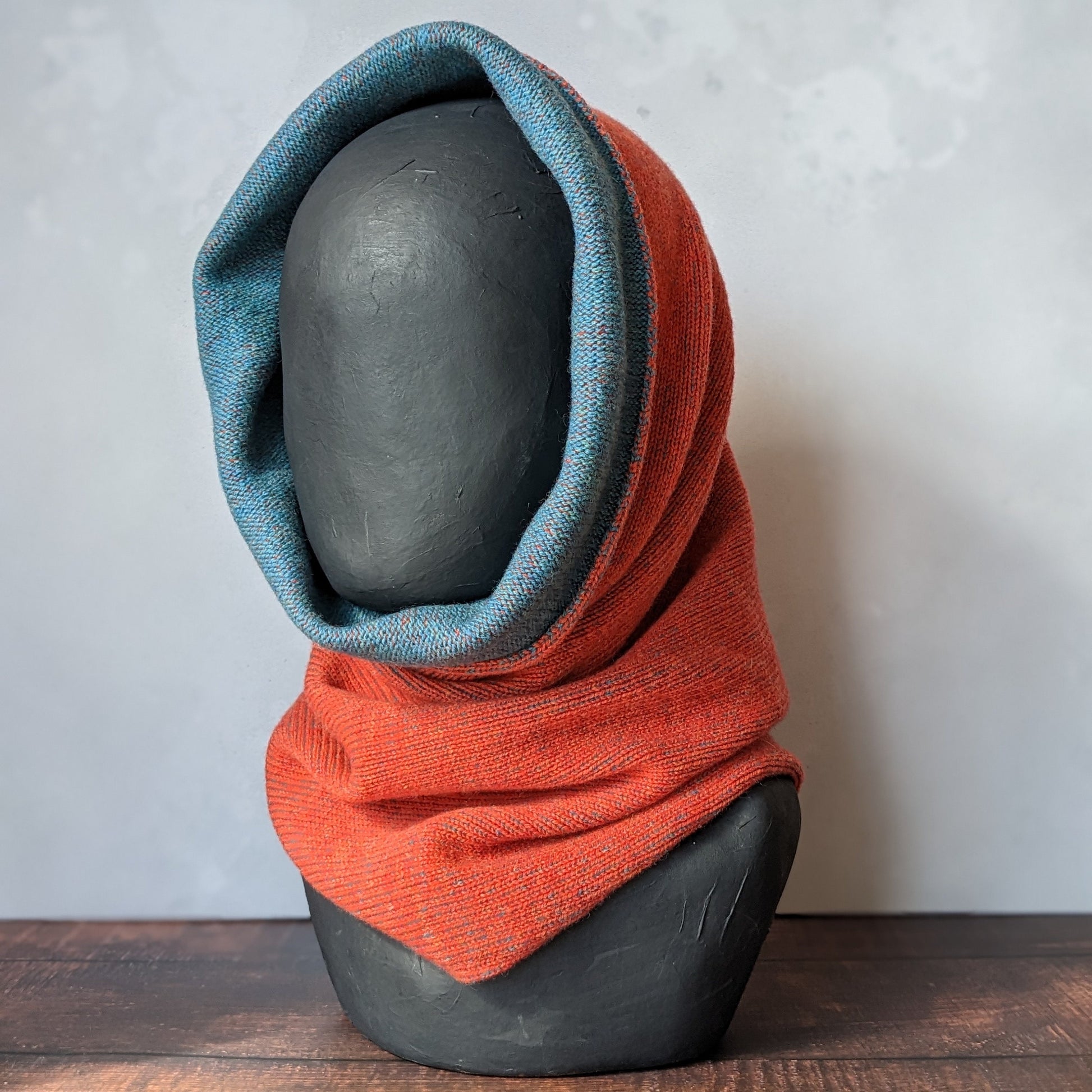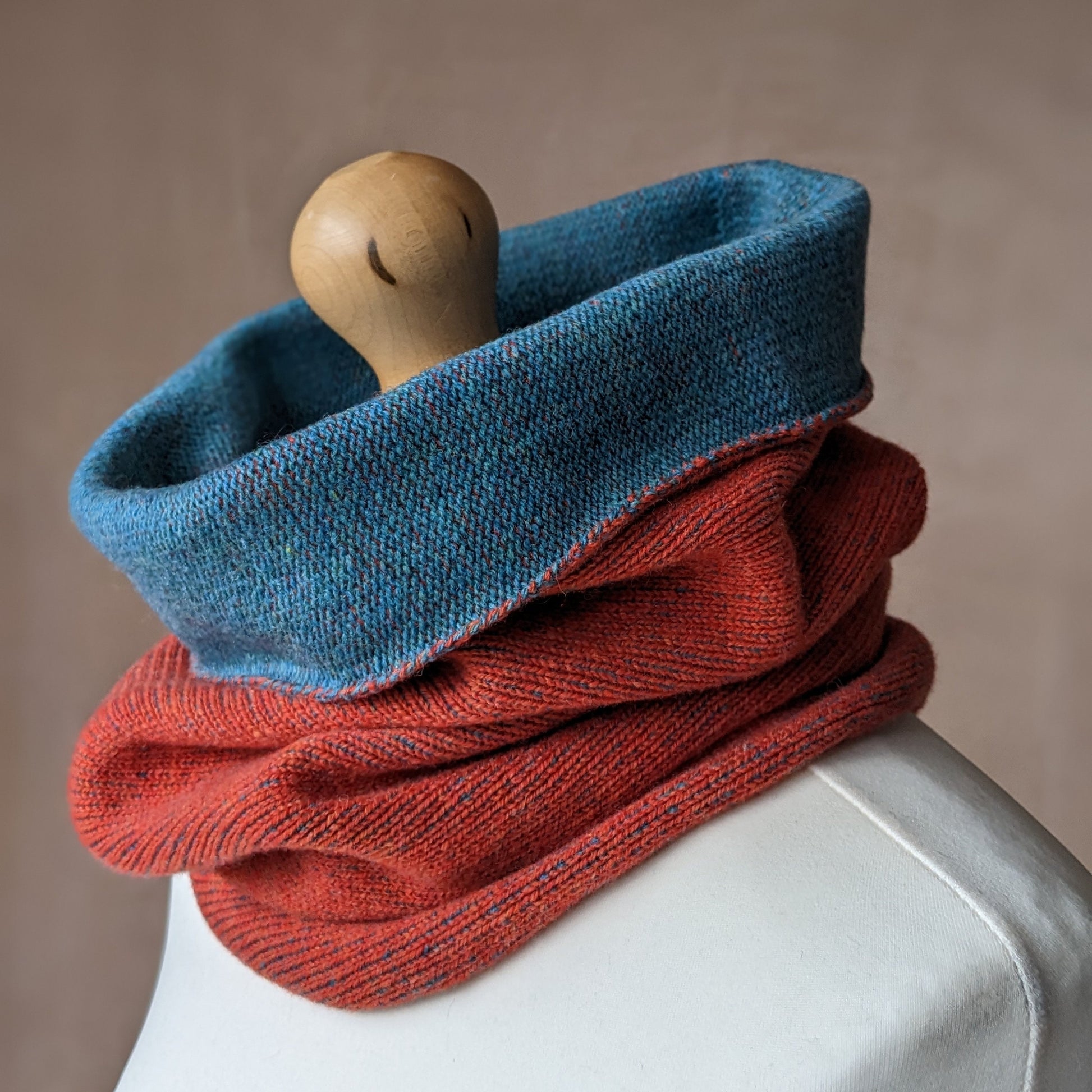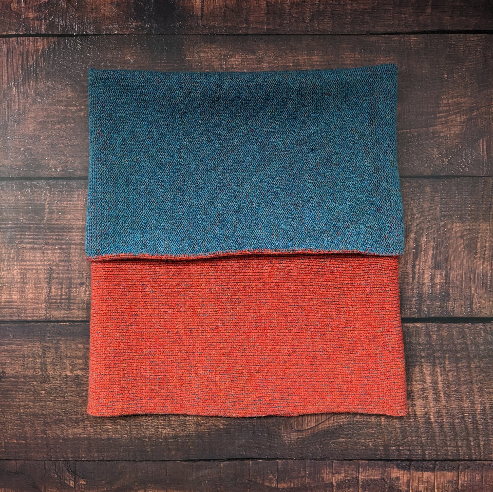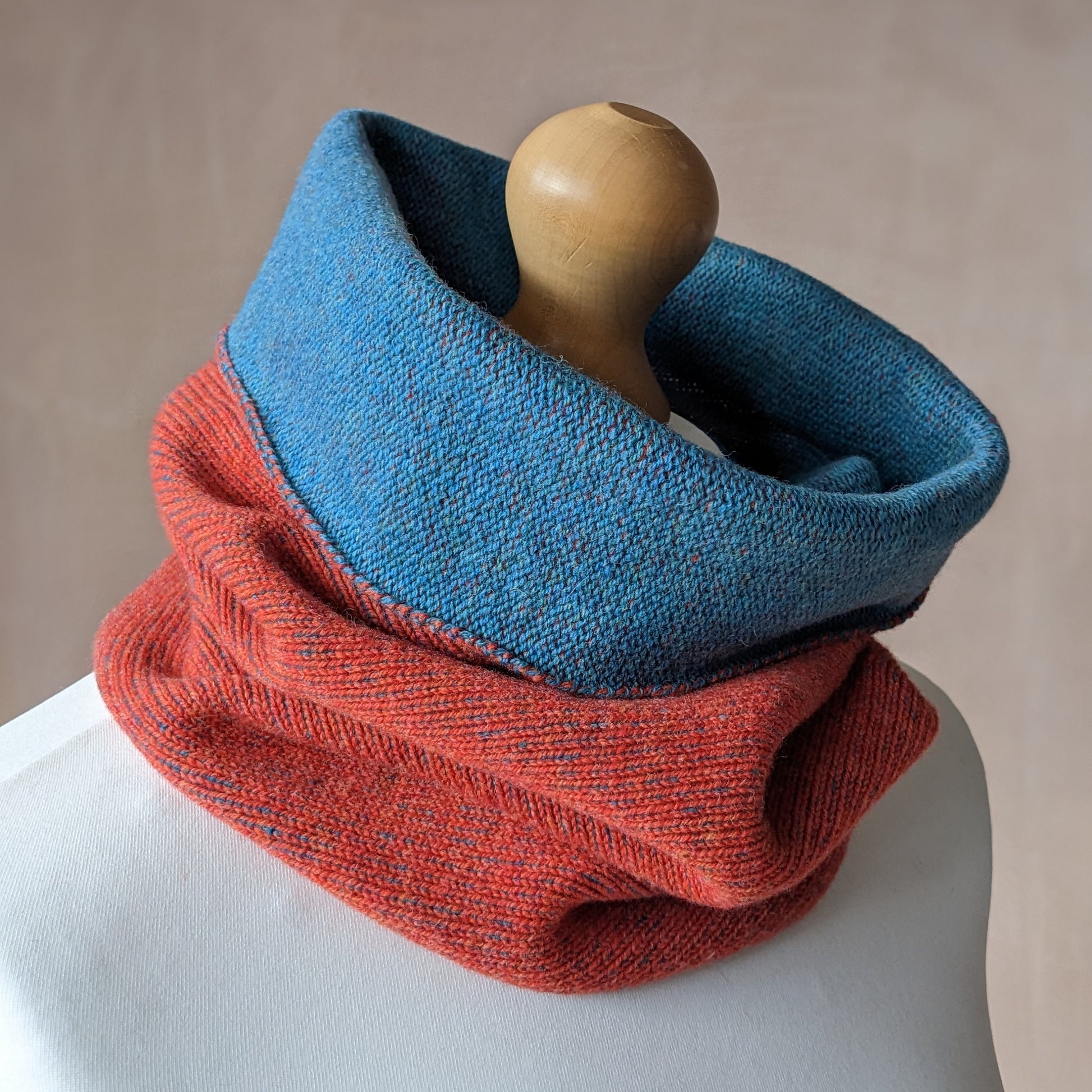 This reversible Merino lambswool snood has been knitted using a plating technique so the knit side of the fabric is orange and the purl side is blue. It can be worn either way or folded back revealing both colours, as shown in the photographs.