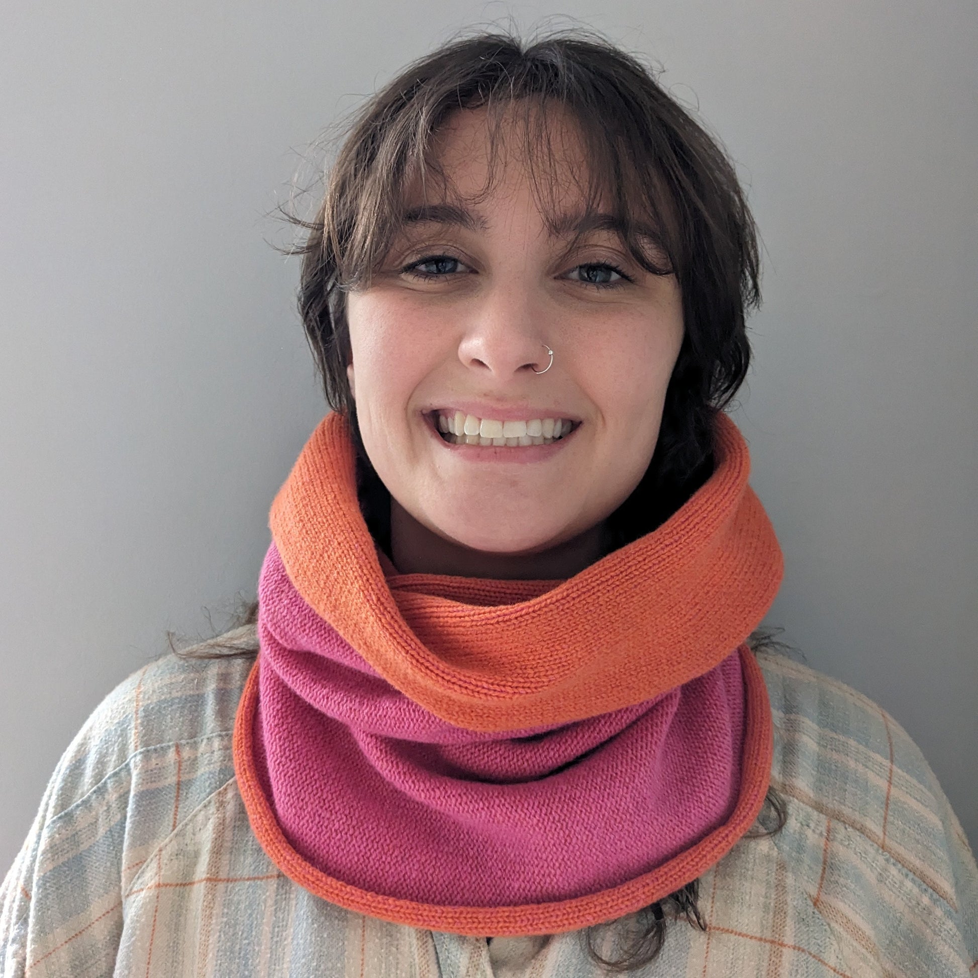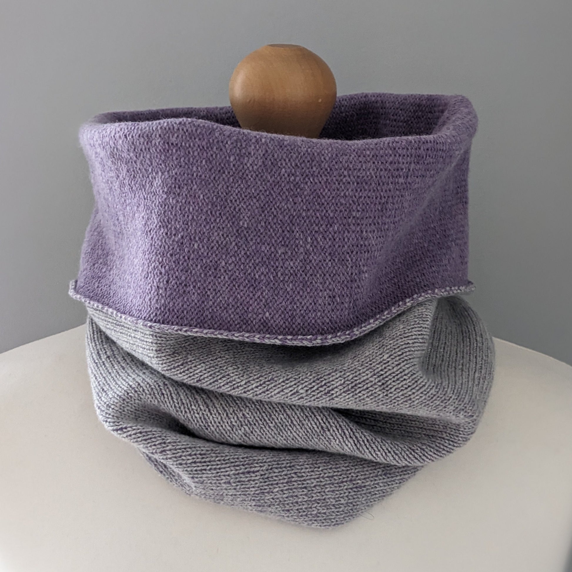 This reversible Merino lambswool snood has been knitted using a plating technique so the knit side of the fabric is pale grey and the purl side is a pretty lilac. It can be worn either way or folded back revealing both colours, as shown in the photographs.