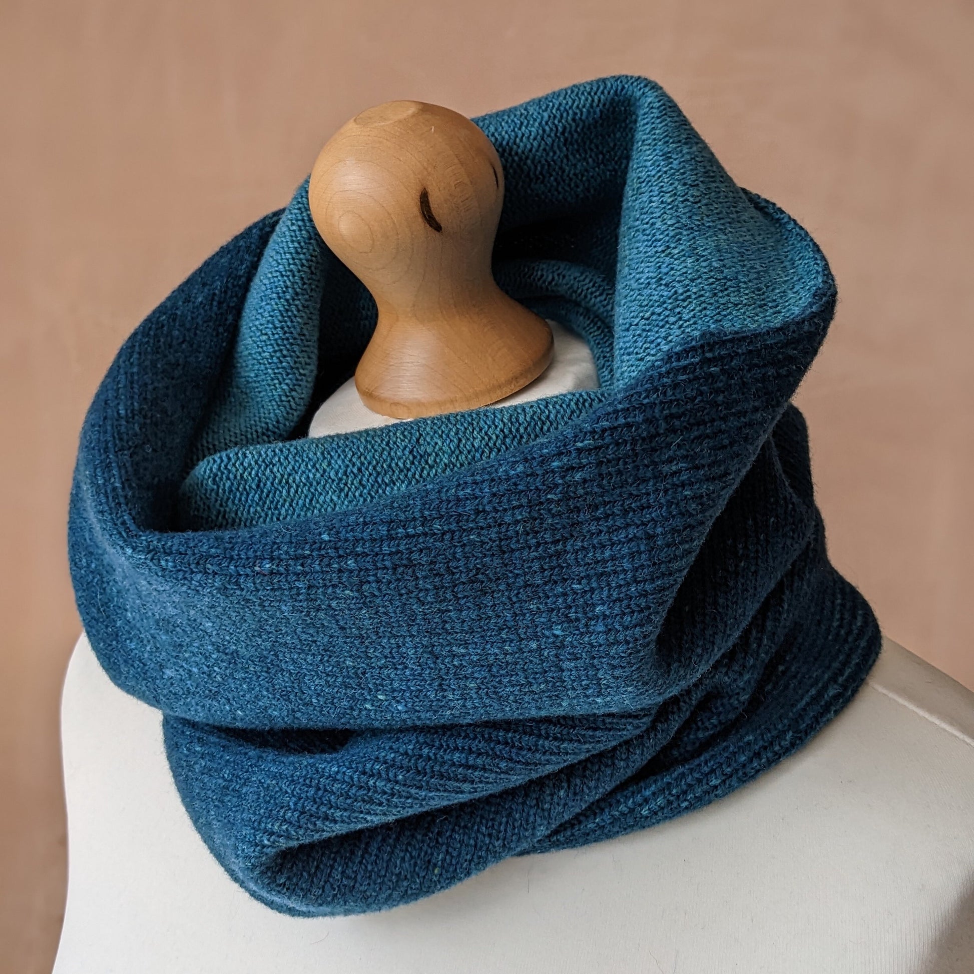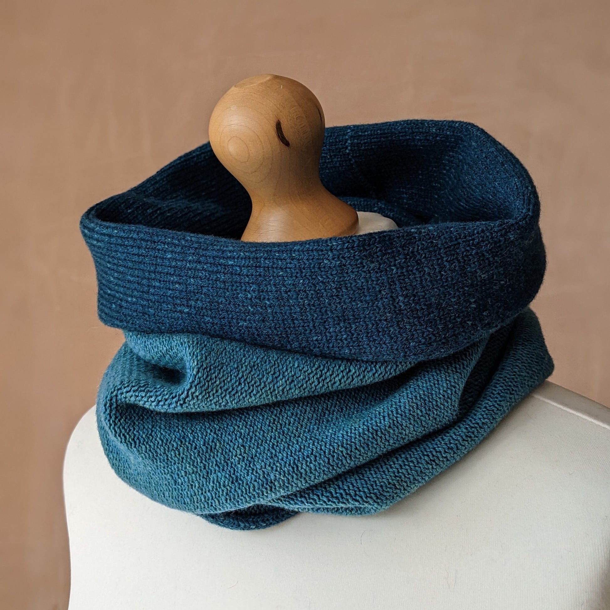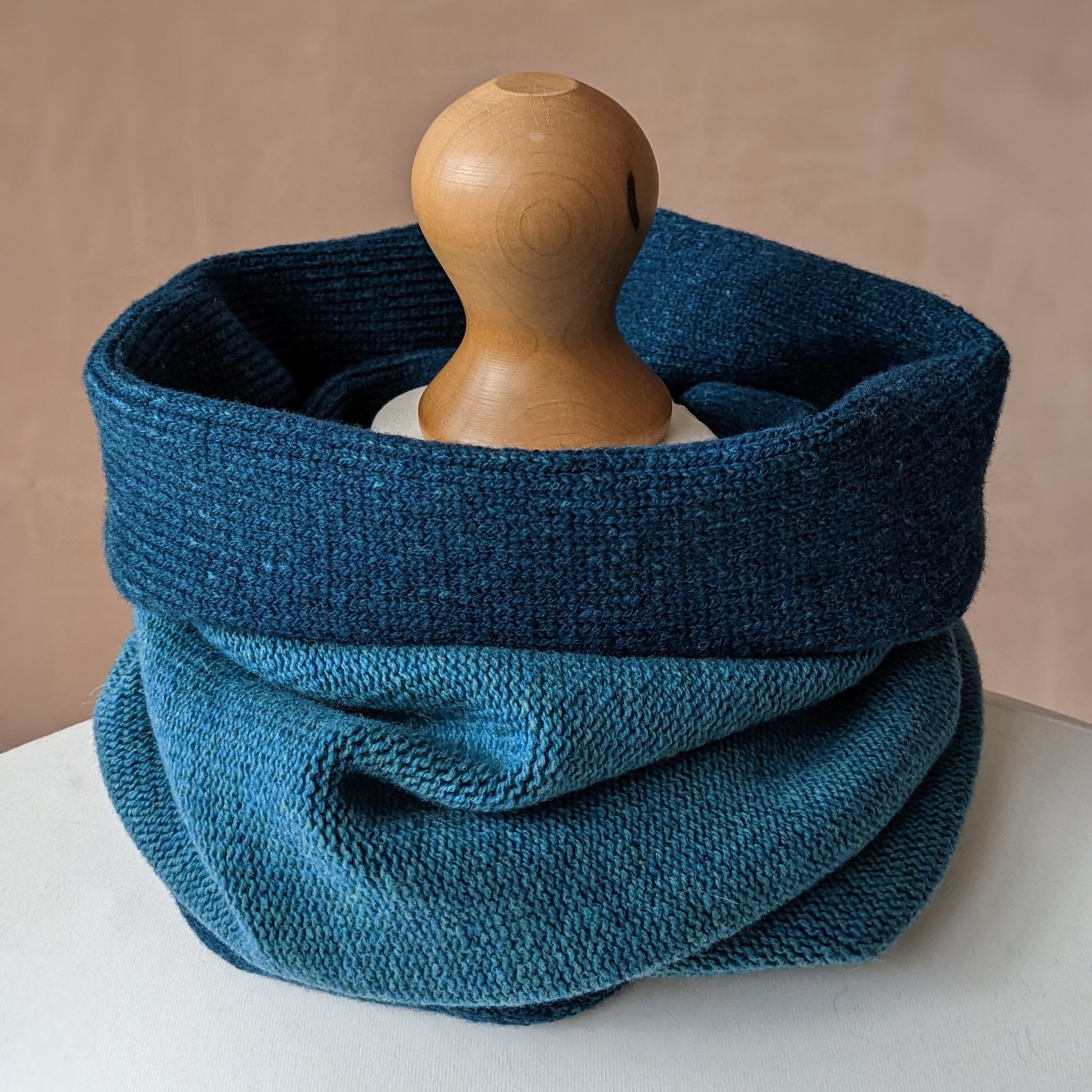 This reversible Merino lambswool snood has been knitted using a plating technique so the knit side of the fabric is dark blue and the purl side is a paler blue. It can be worn either way or folded back revealing both colours, as shown in the photographs.